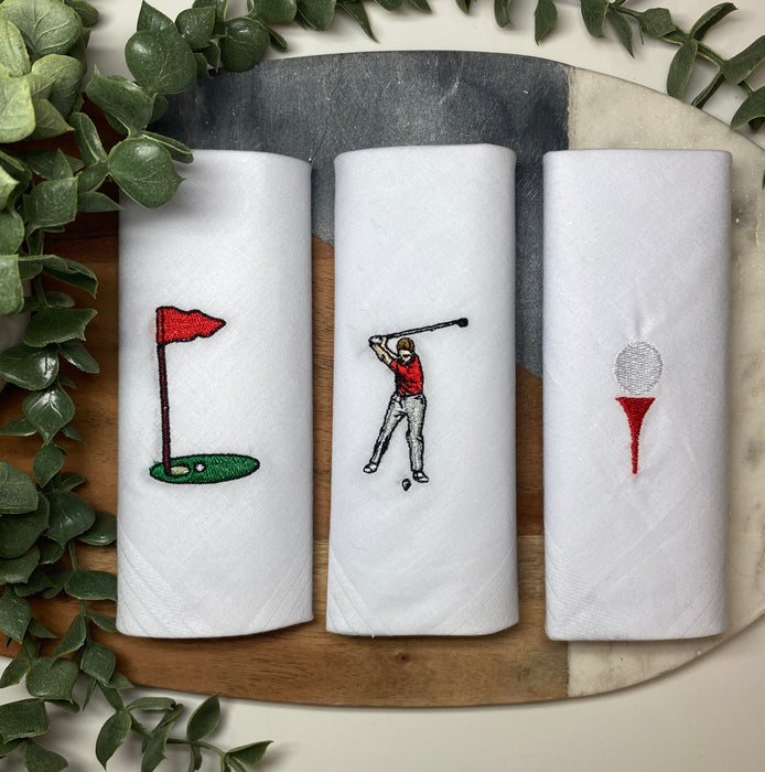 A must-have for golf lovers! These crisp white men's hankies feature beautifully embroidered golf inspired emblems, perfect for any golf enthusiast. The pack of three handkerchiefs come boxed making them a great gift idea too.