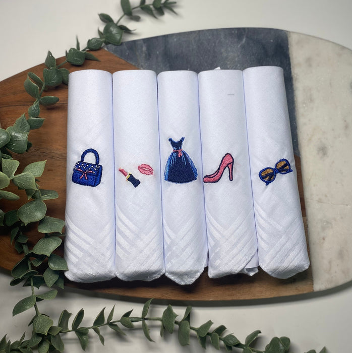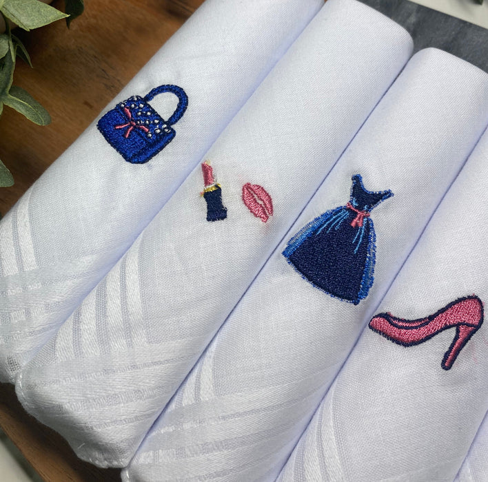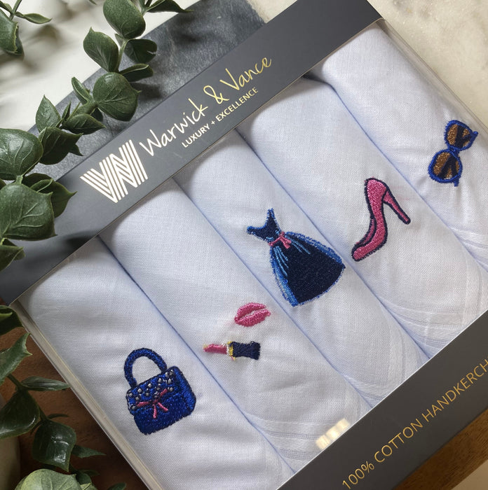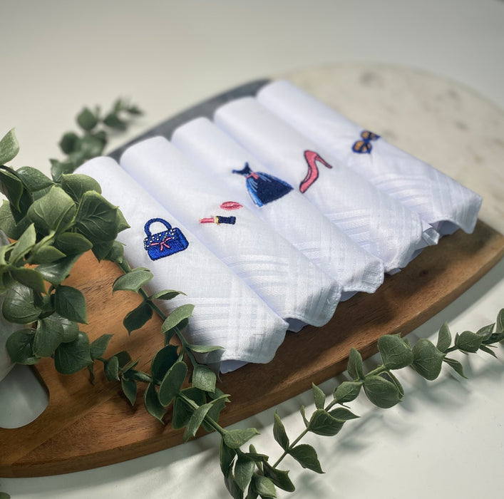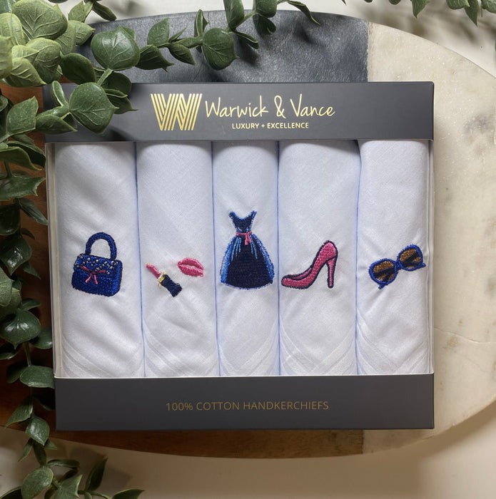 These fun Warwick & Vance Party Embroidery 5 Pack Women's Handkerchiefs make a lovely addition to your hankies collection. Made with 100% cotton, these hankies feature stylish designs including a party dress, handbag and shoes. Machine washable and giftable, these handkerchiefs are perfect for any occasion.