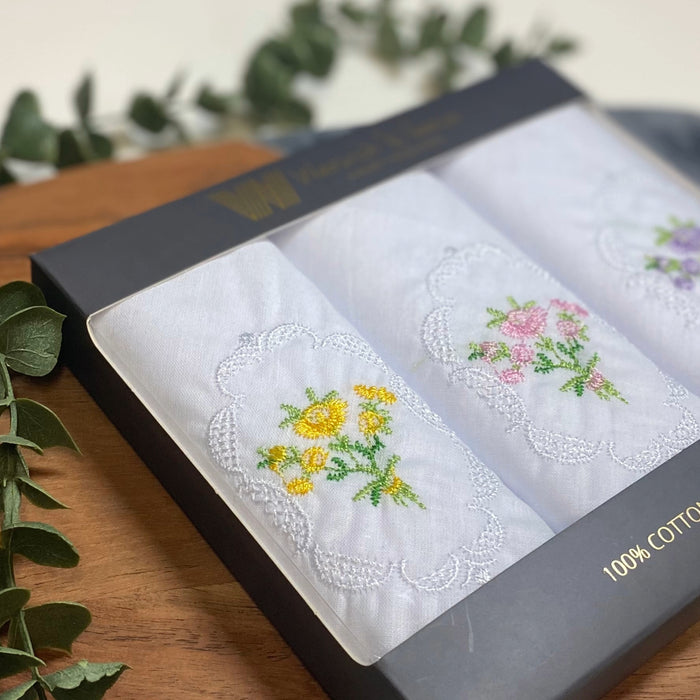 Well-presented ladies' white handkerchiefs with a pretty floral embroidered design, these women's boxed hankies come in a pack of three with two designs available. The design received is chosen at random as these are assorted packs.