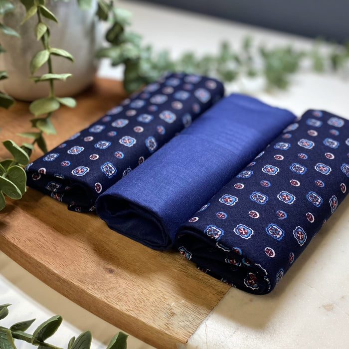 These Warwick & Vance Men's 100% Cotton Blue Patterned Handkerchiefs come in a 3 pack, perfect for any occasion. Made with 100% cotton, they are soft and eco-friendly. The blue patterned design adds a touch of style, while the packaging makes them great for gifting. Always have a stylish and sustainable handkerchief on hand with this set from Warwick & Vance!