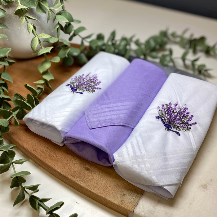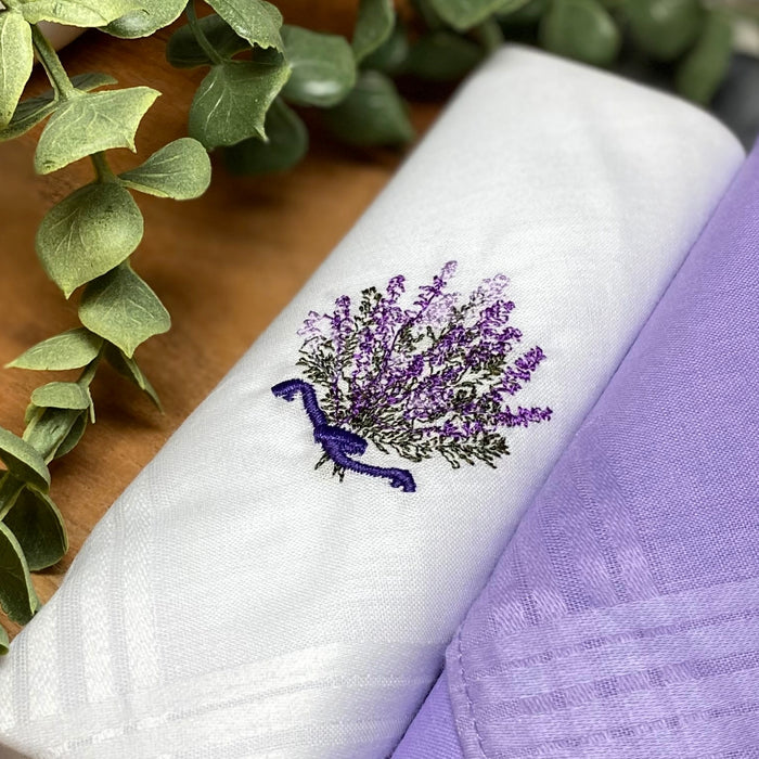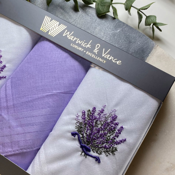 Keep your day fresh with Warwick & Vance 100% cotton handkerchiefs! Designed specifically for ladies with elegant lavender embroidery. Comes in a chic white box, perfect for on-the-go use or as a gift.