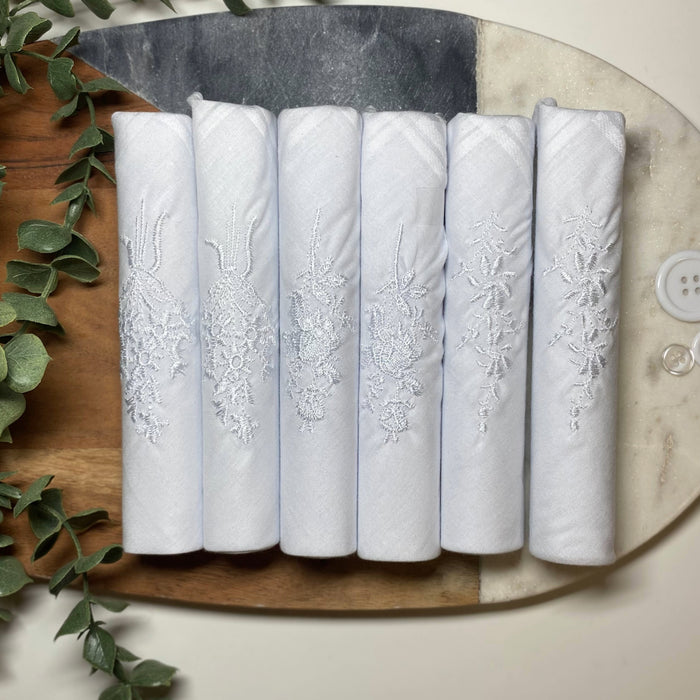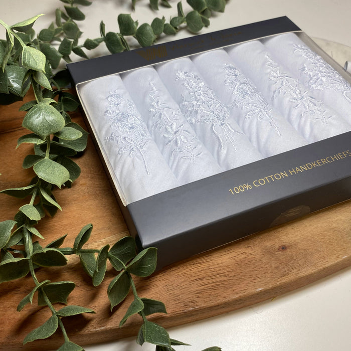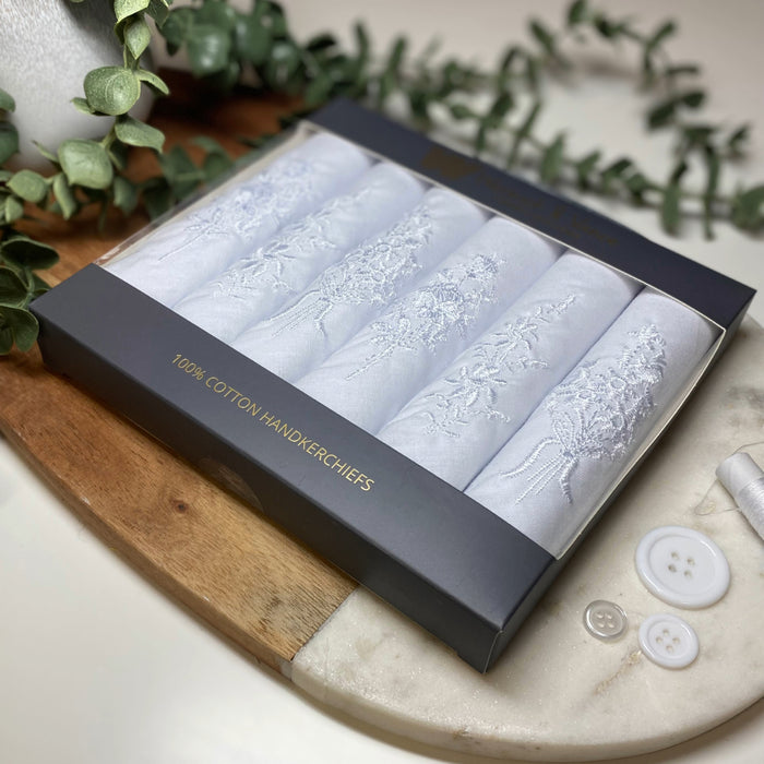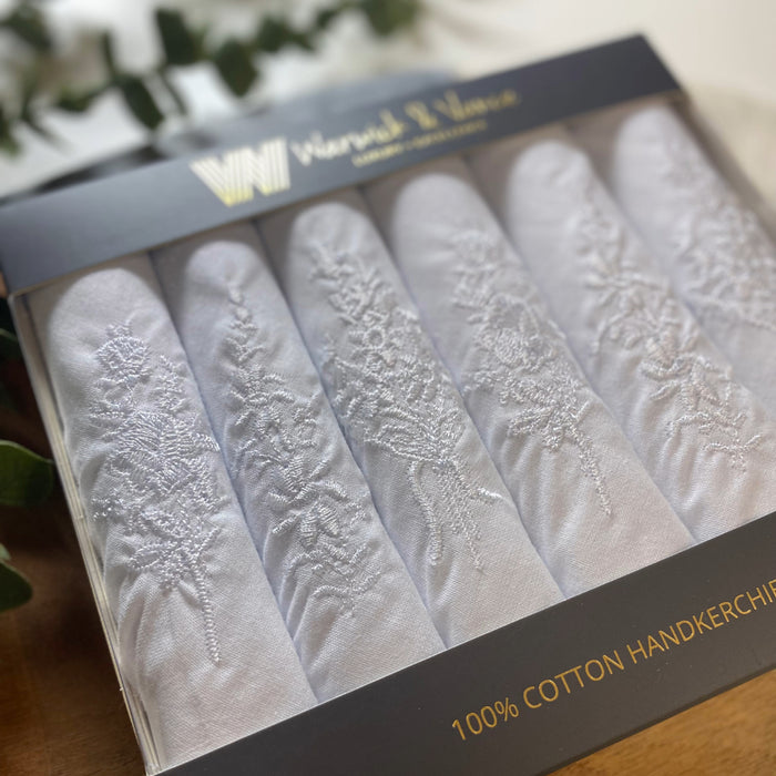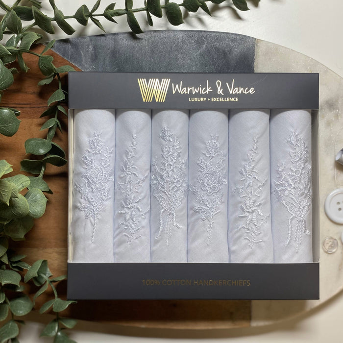 Warwick & Vance offer quality, detailed handkerchiefs that are perfect for everyday use, this pack of 6 embroidered women's handkerchiefs offers individual floral designs set against the crisp white of the hankie. Perfect for a special occasion or keeping in your handbag these luxury ladies' hankies are easily washable to make sure you can reuse them over and over again.